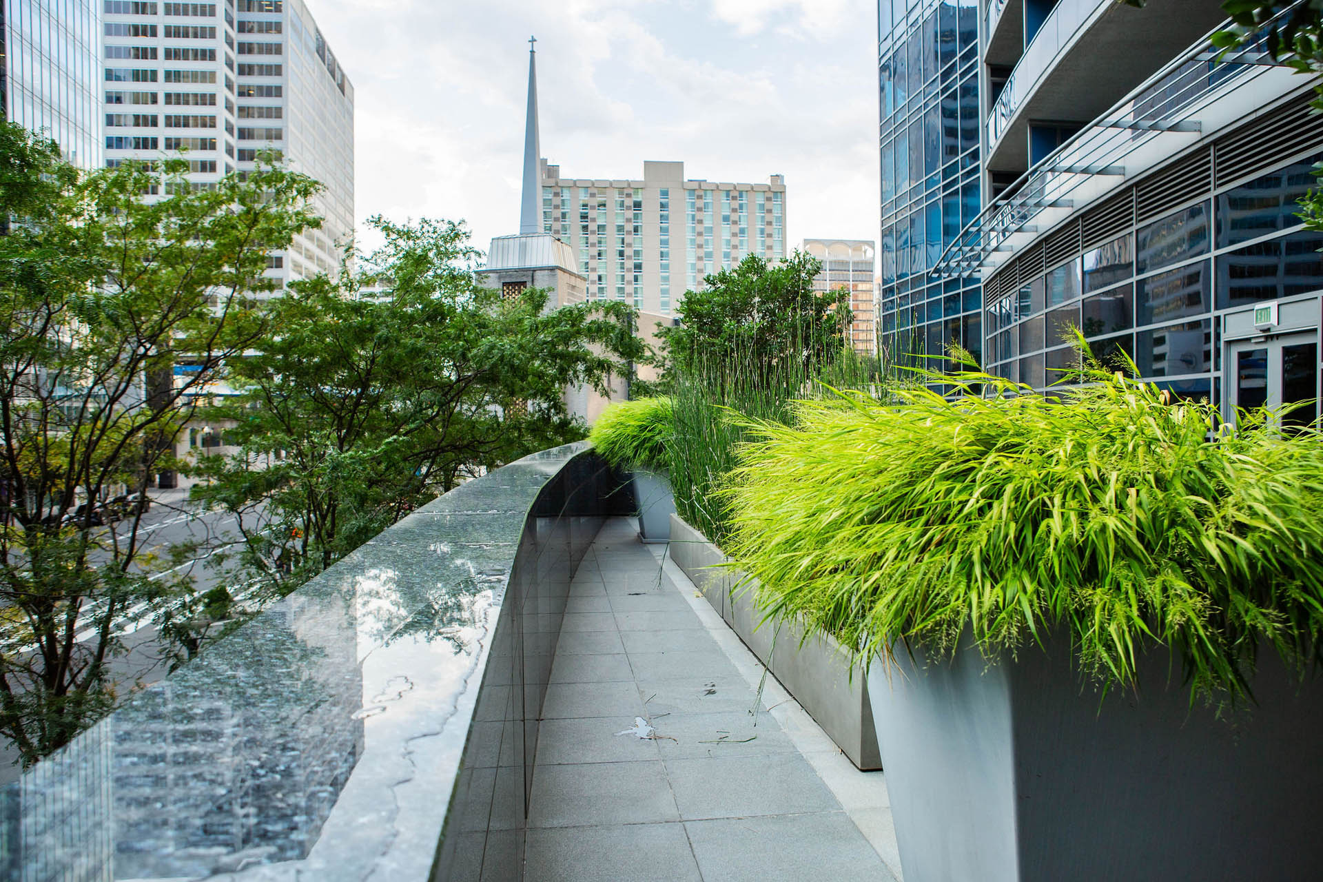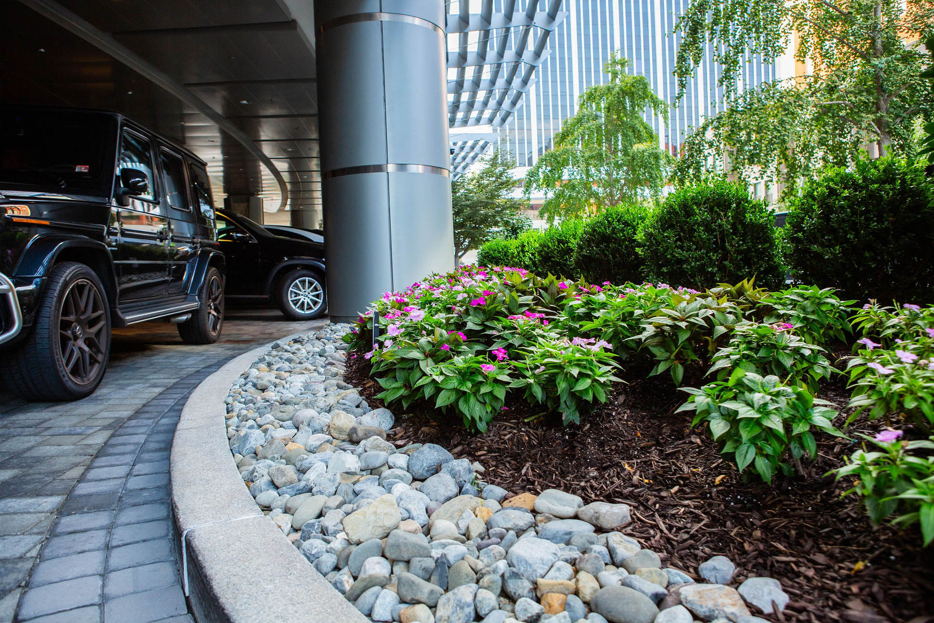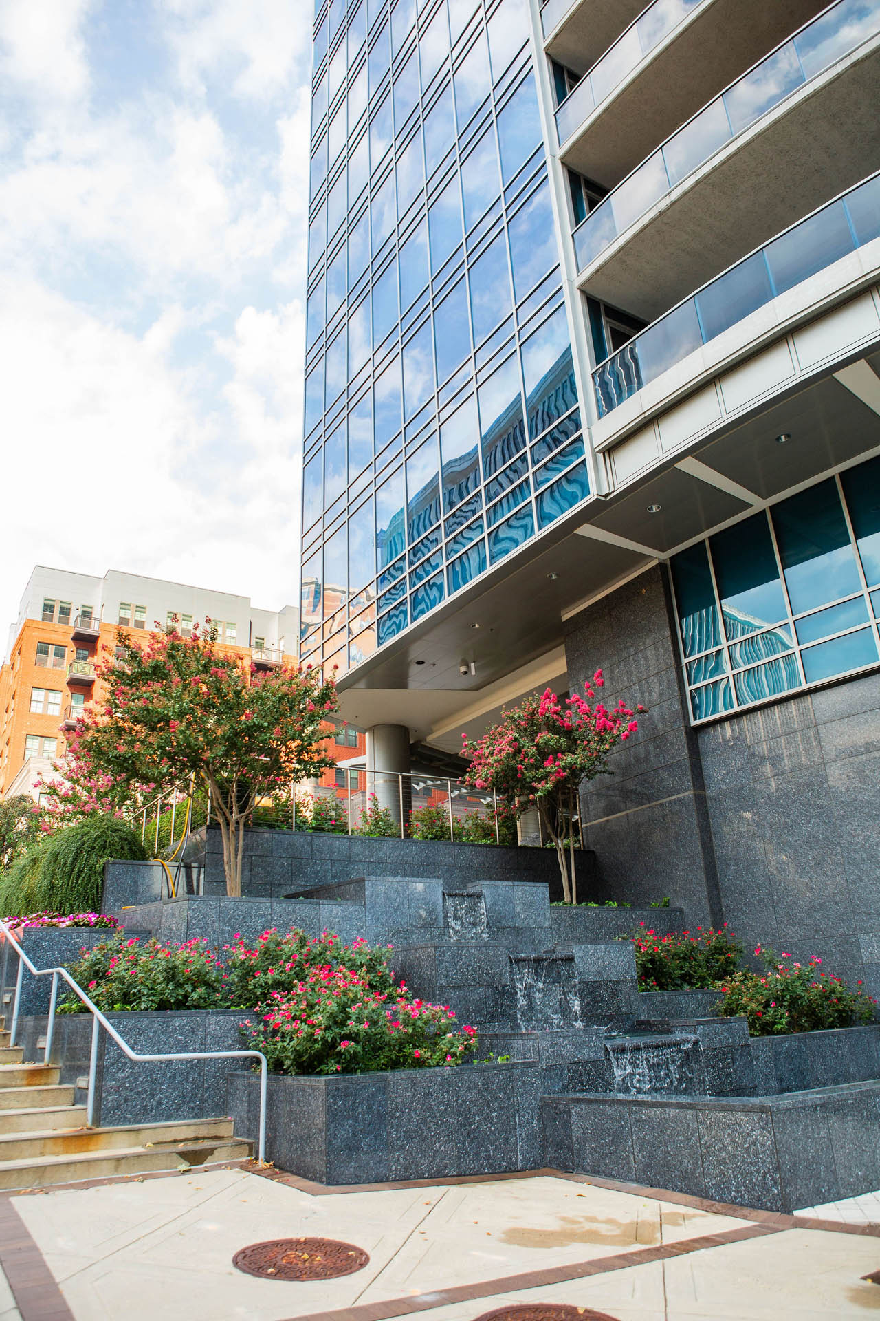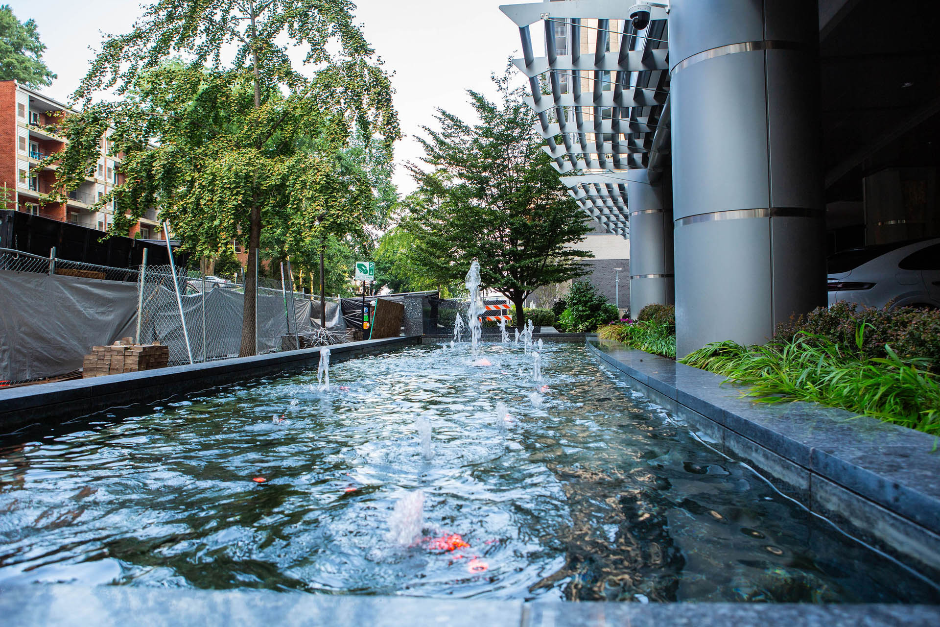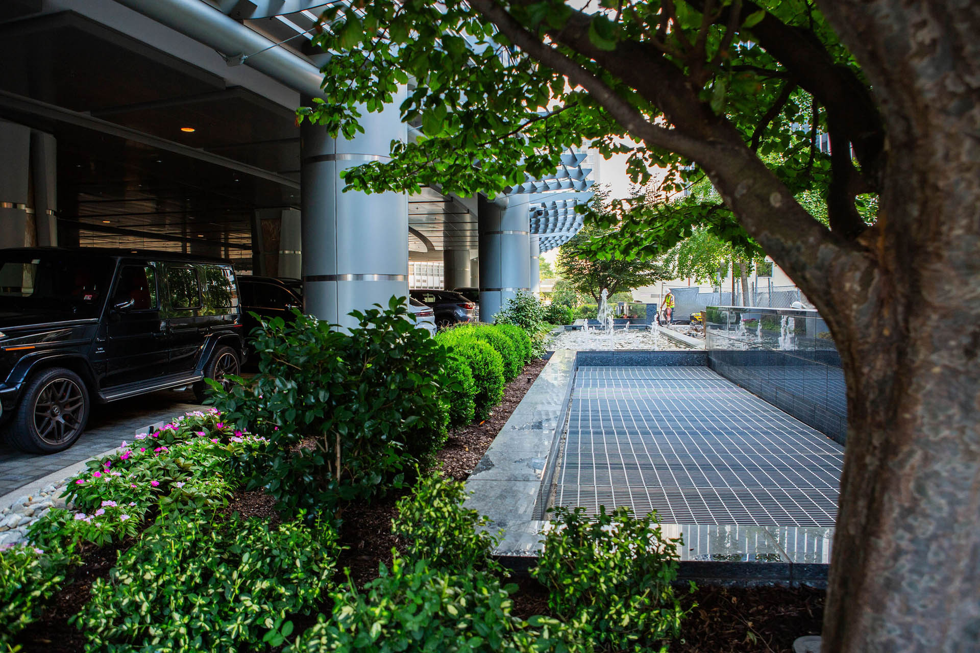 Turnberry Tower’s landscape is further enhanced by a striking tiered fountain, seamlessly integrated into the hardscape design. The cascading water feature adds an elegant touch of tranquility to the urban setting, providing a serene spot for residents to enjoy. The surrounding hardscapes, including carefully maintained pathways and seating areas, are designed to harmonize with the lush plantings and vibrant flowers, offering both aesthetic beauty and functional space for relaxation.