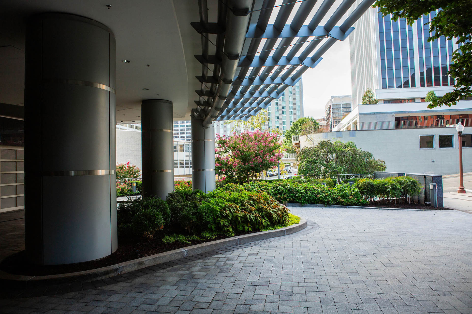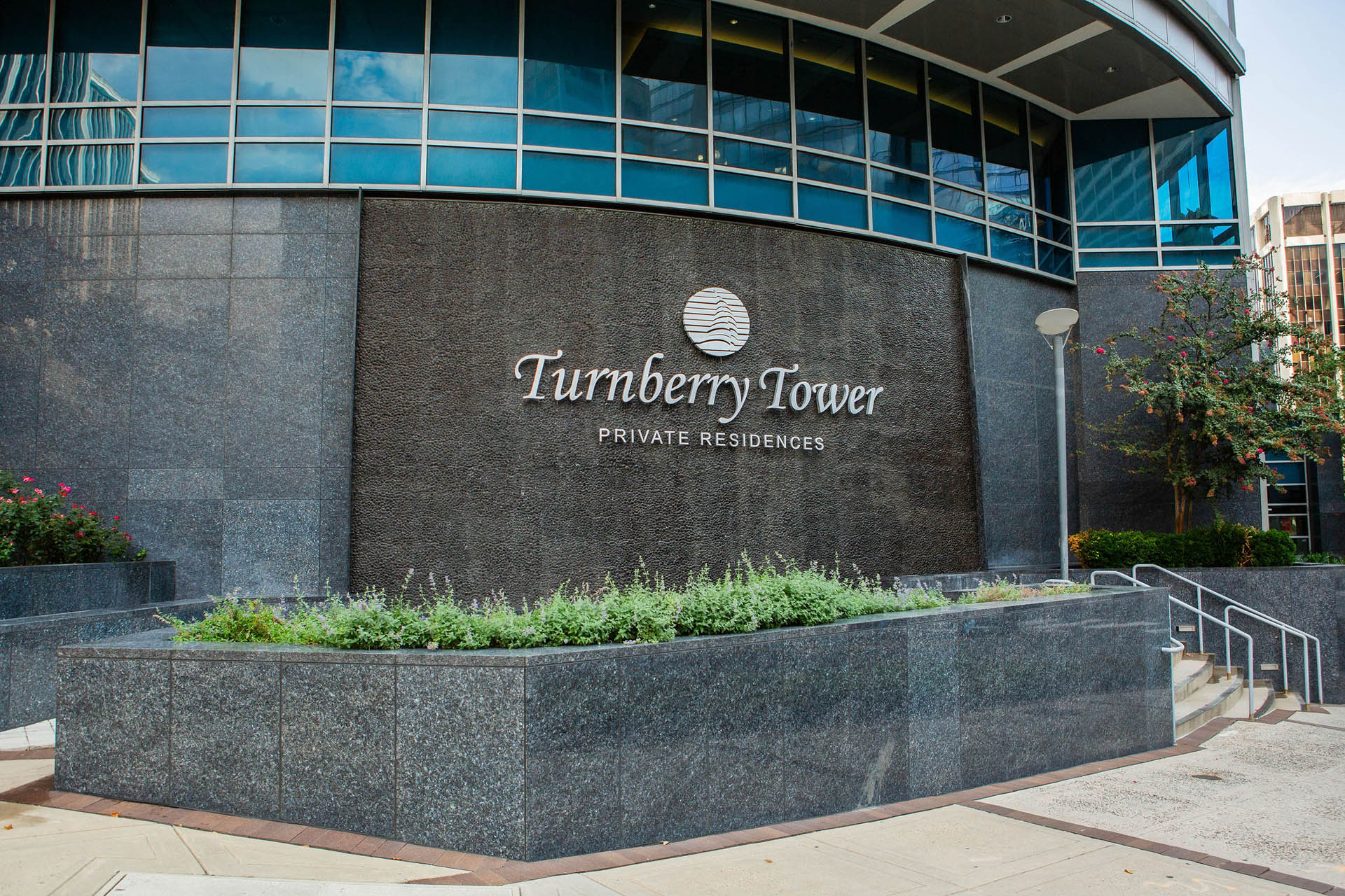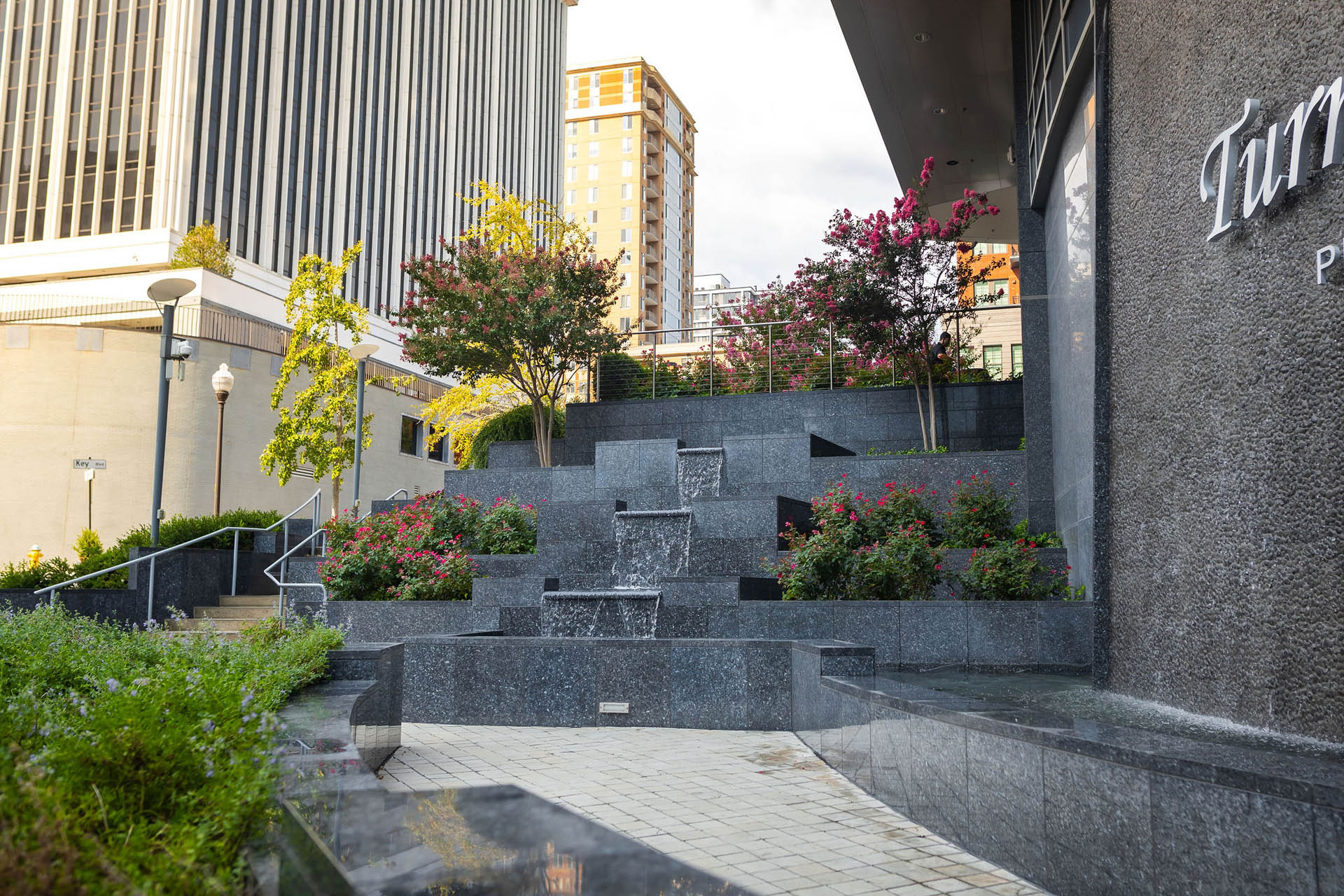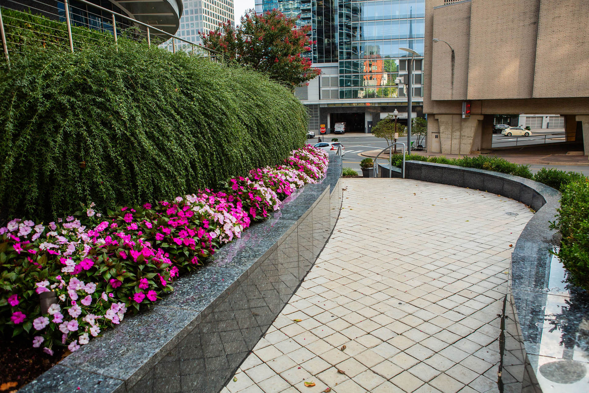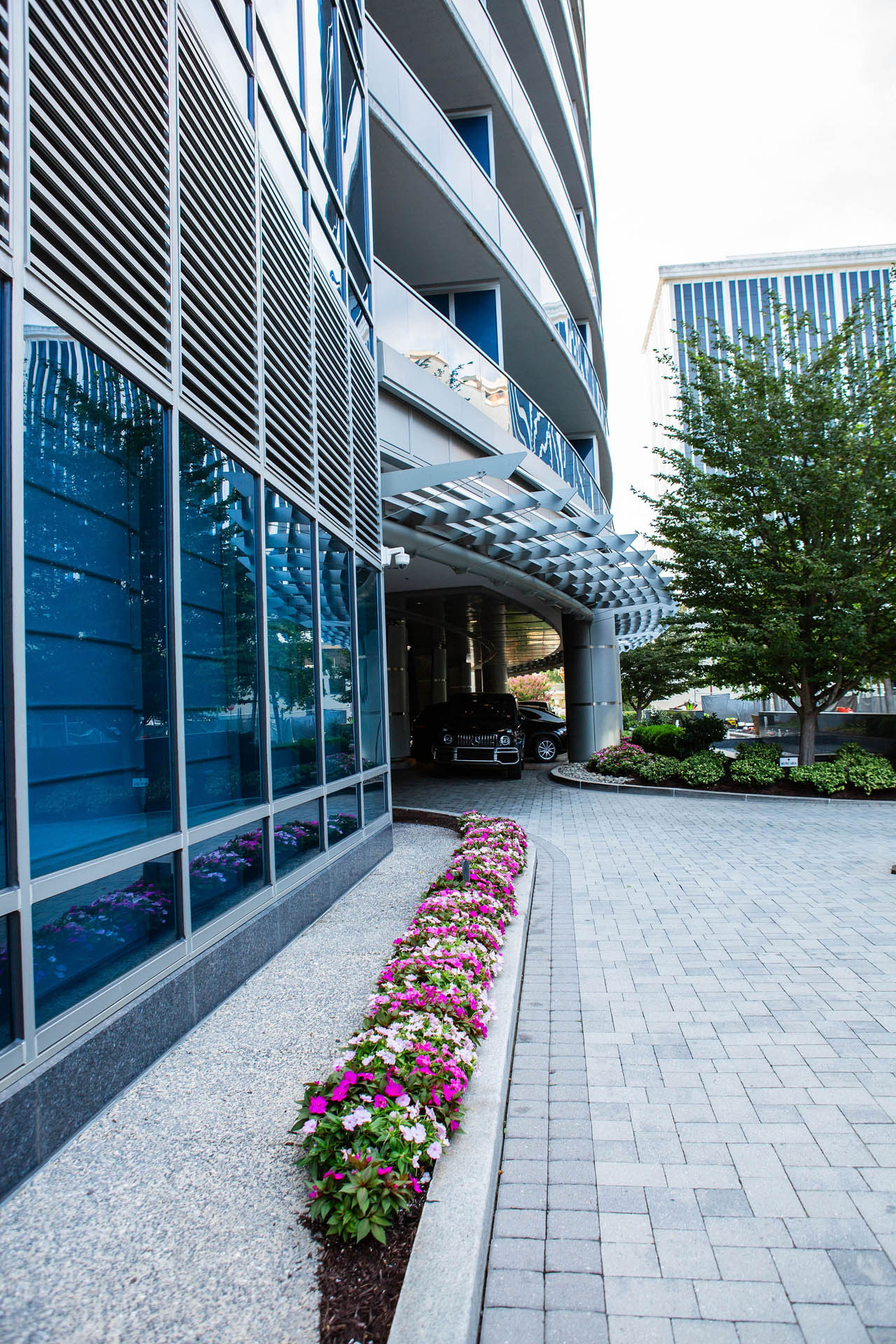 Turnberry Tower’s landscape is further enhanced by a striking tiered fountain, seamlessly integrated into the hardscape design. The cascading water feature adds an elegant touch of tranquility to the urban setting, providing a serene spot for residents to enjoy. The surrounding hardscapes, including carefully maintained pathways and seating areas, are designed to harmonize with the lush plantings and vibrant flowers, offering both aesthetic beauty and functional space for relaxation.