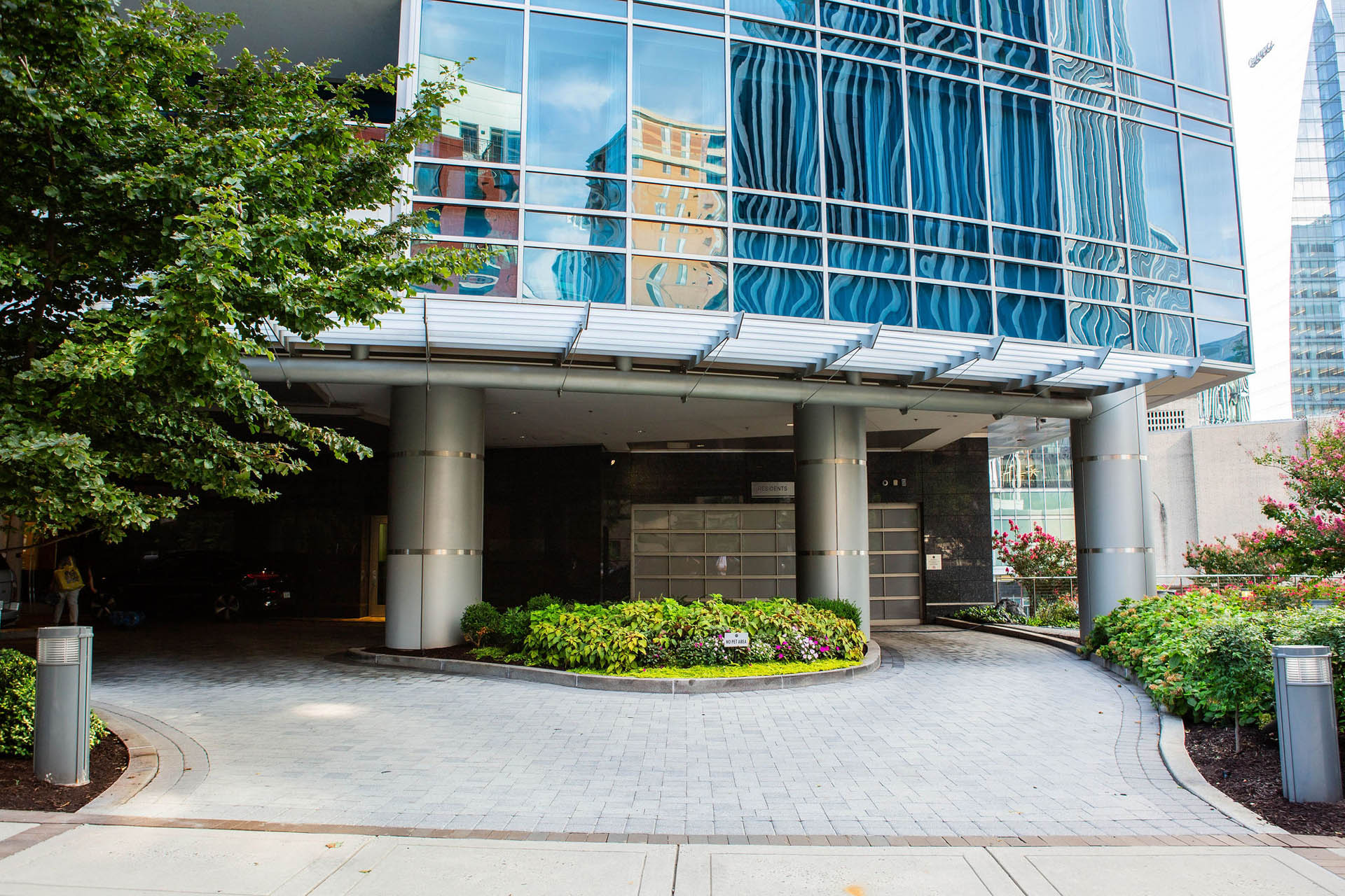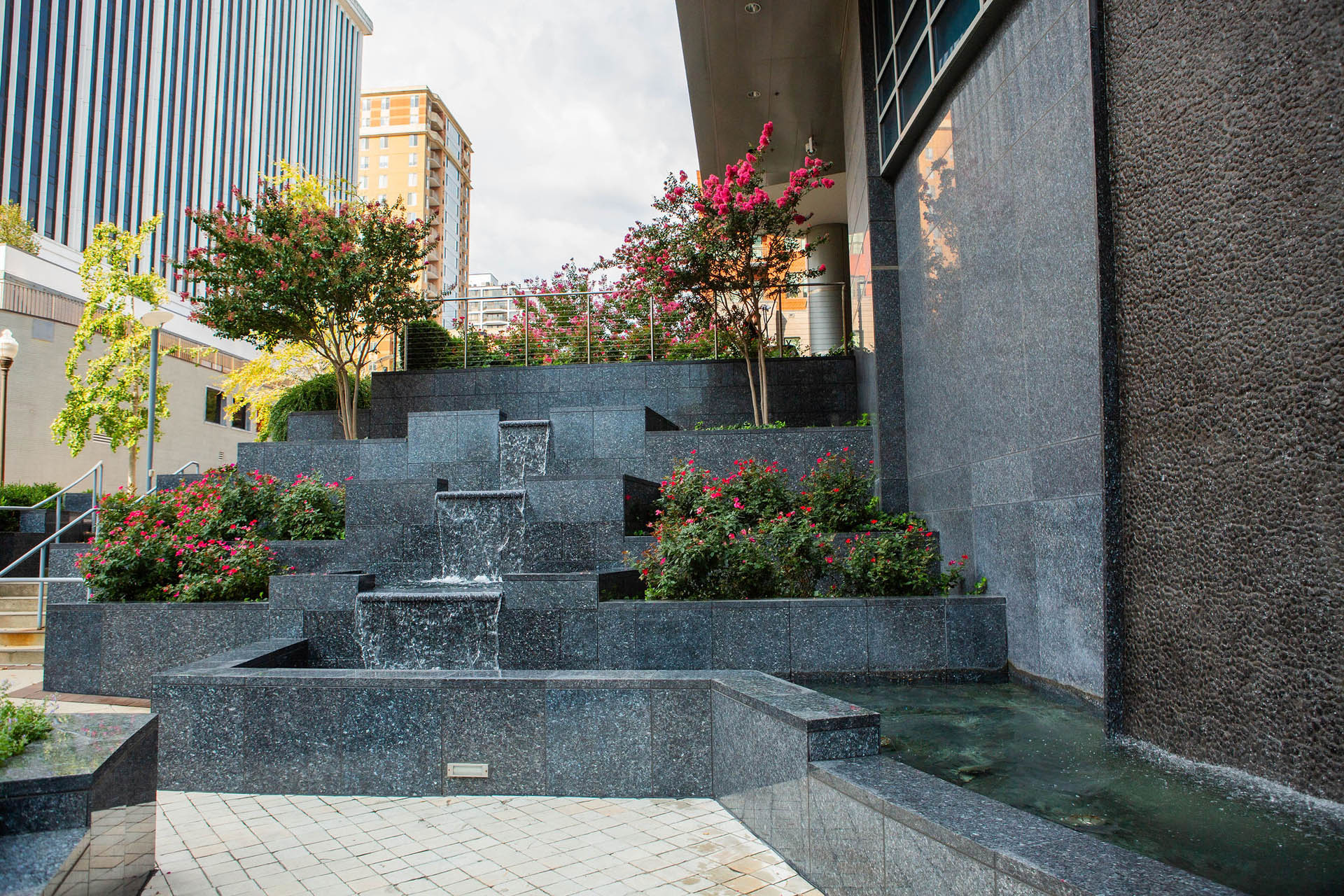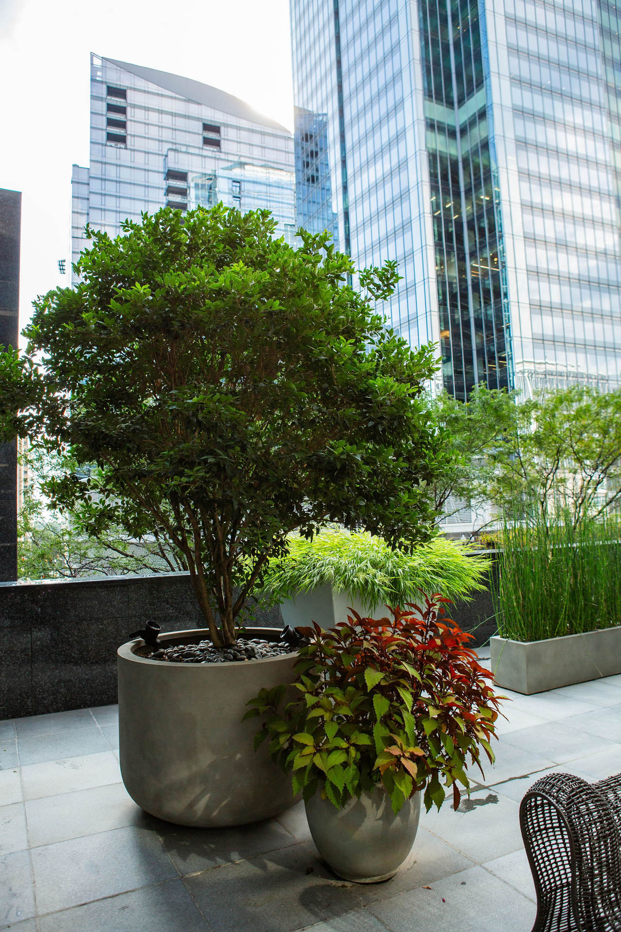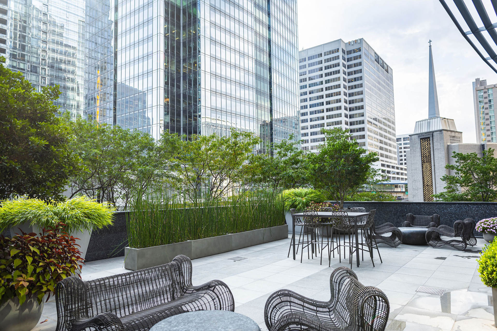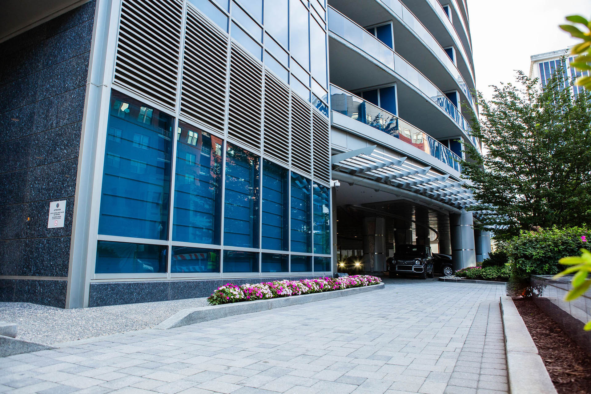 Turnberry Tower’s landscape is further enhanced by a striking tiered fountain, seamlessly integrated into the hardscape design. The cascading water feature adds an elegant touch of tranquility to the urban setting, providing a serene spot for residents to enjoy. The surrounding hardscapes, including carefully maintained pathways and seating areas, are designed to harmonize with the lush plantings and vibrant flowers, offering both aesthetic beauty and functional space for relaxation.