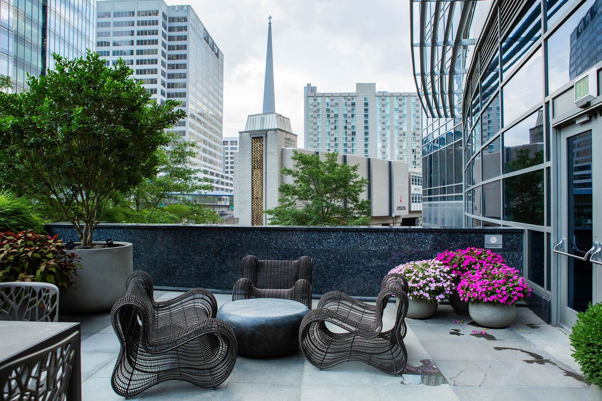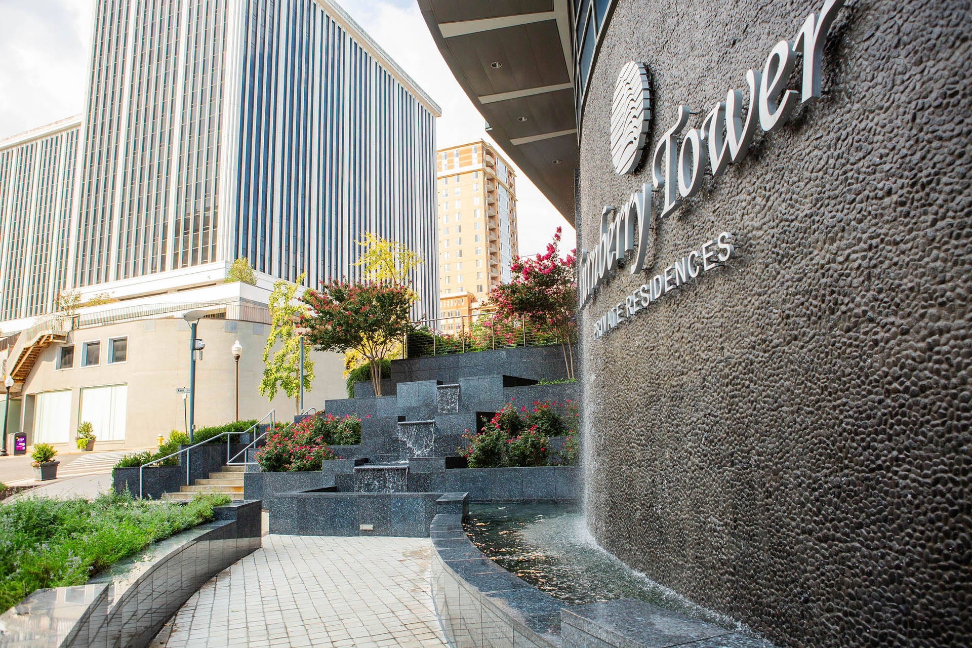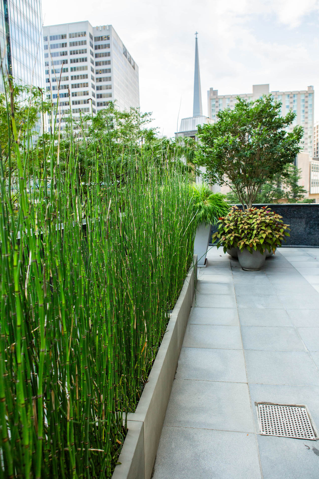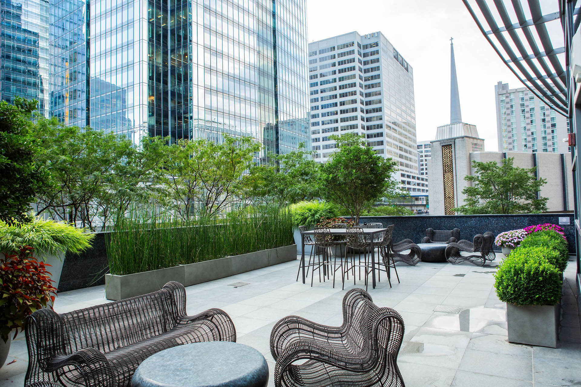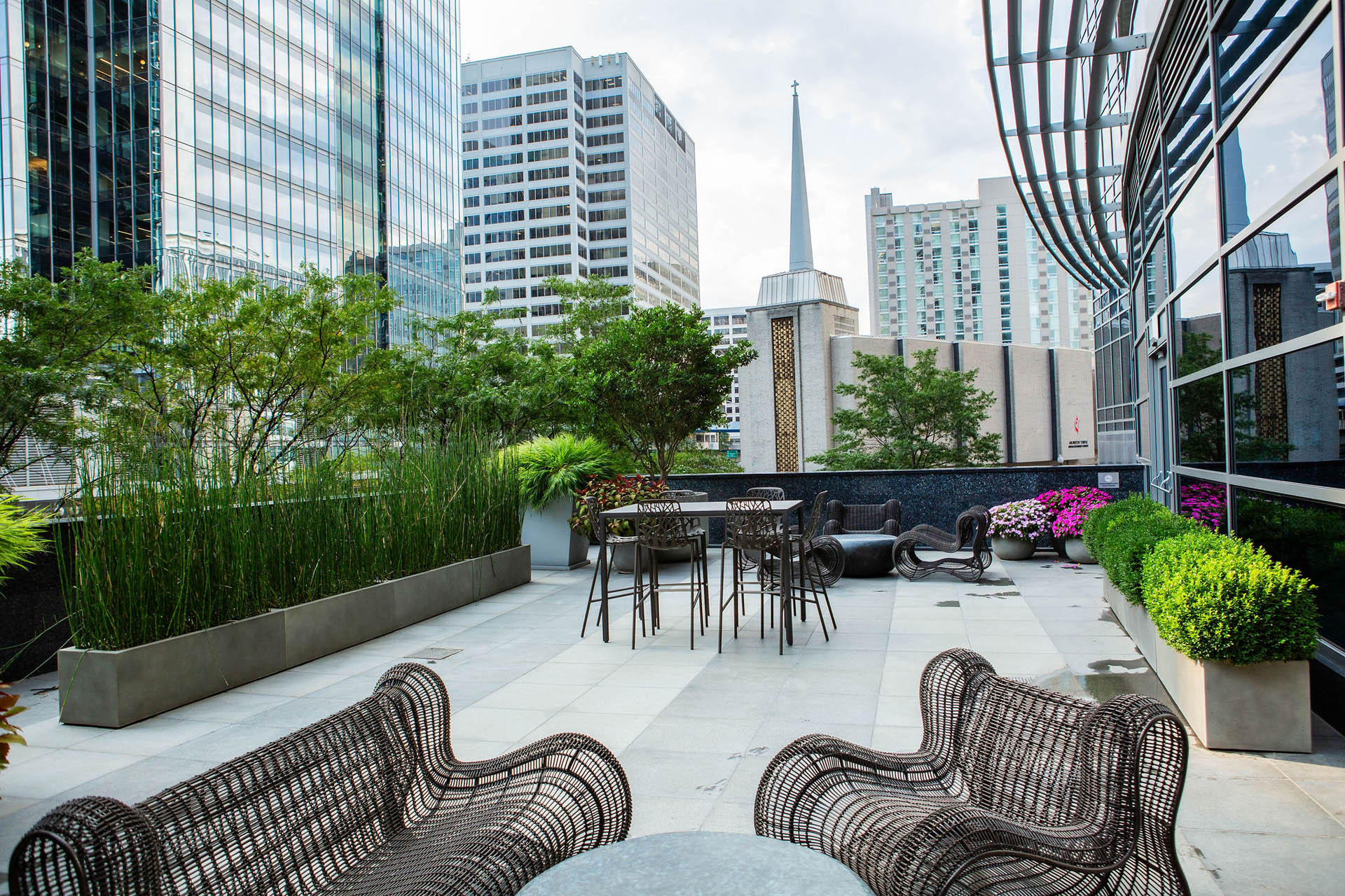 Turnberry Tower’s landscape is further enhanced by a striking tiered fountain, seamlessly integrated into the hardscape design. The cascading water feature adds an elegant touch of tranquility to the urban setting, providing a serene spot for residents to enjoy. The surrounding hardscapes, including carefully maintained pathways and seating areas, are designed to harmonize with the lush plantings and vibrant flowers, offering both aesthetic beauty and functional space for relaxation.